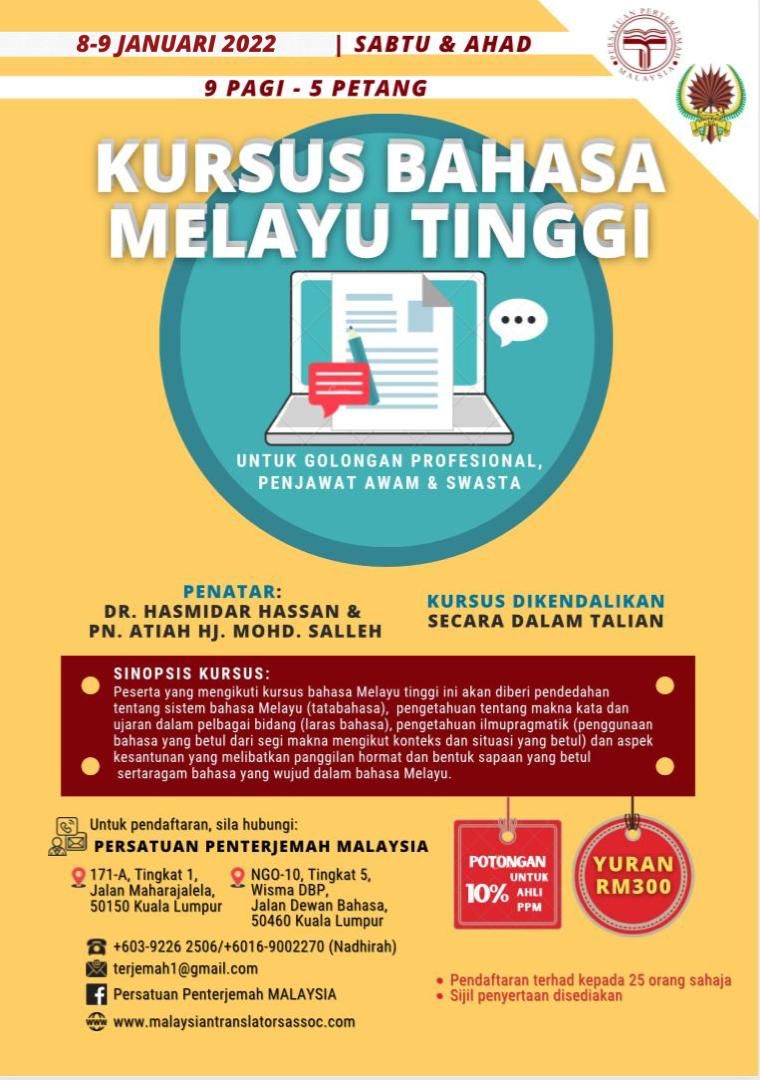 KURSUS PENYUNTINGAN TERJEMAHAN BAHASA INGGERIS Tarikh : 9 & 10 Oktober 2021 (Sabtu & Ahad)Masa : 9.00 pagi – 5.00 petangMod : Dalam TalianYuran : RM300(potongan 10% untuk ahli PPM) ✅ Maklumat lanjut dan pendaftaran:Cik Nadhirah Ayob – 016 9002 270 Daftar sekarang Persatuan Penterjemah Malaysia171-A1, Tingkat 1, Jalan Maharajalela,50150 Kuala Lumpur.E-mel : [email protected] web: […]